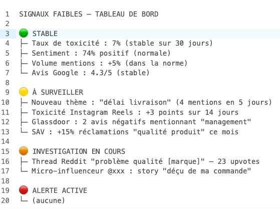 L'avantage concurrentiel : Les marques qui détectent les signaux faibles agissent quand leurs concurrents dorment encore. Elles corrigent les problèmes avant qu'ils ne soient visibles. Elles ajustent leur communication avant la polémique. Elles transforment un risque en opportunité d'amélioration.