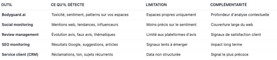 Chez Bodyguard.ai, nous contribuons à cette vigilance en fournissant une couche de données unique : l'analyse en temps réel de la toxicité et du sentiment sur vos espaces de conversation. Ces données, combinées à votre social monitoring, vos métriques d'avis et vos remontées terrain, forment un système de détection complet qui vous donne les jours — parfois les semaines — d'avance nécessaires pour agir avant la crise.