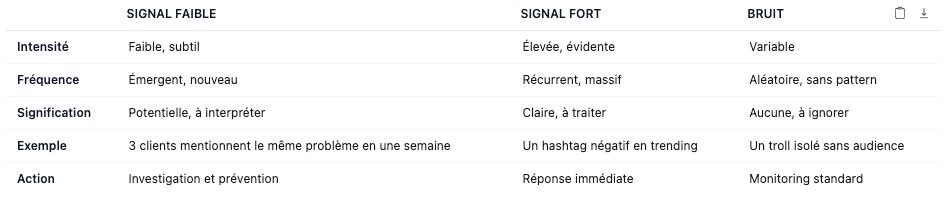 Un signal faible est une information précoce, souvent ambiguë et de faible intensité, qui annonce un changement potentiel dans la perception de votre marque. Pris isolément, un signal faible ne signifie rien. Combiné à d'autres signaux, il dessine une tendance qui peut devenir une crise si elle n'est pas traitée.